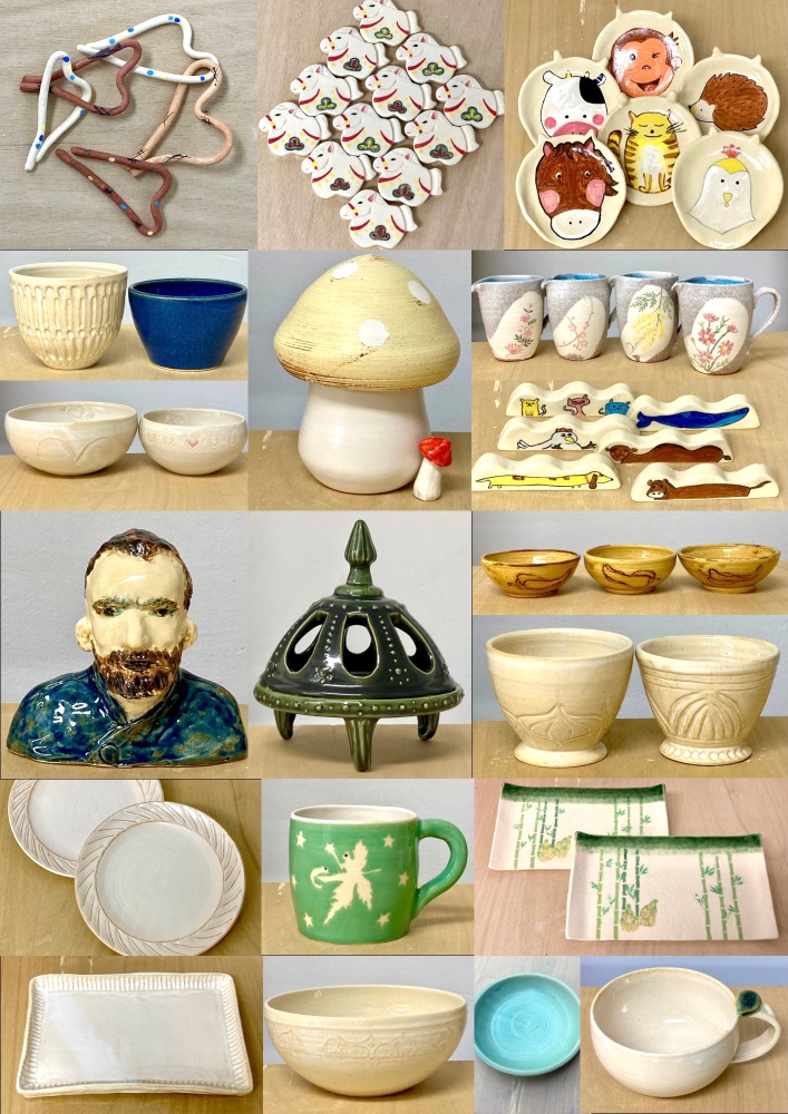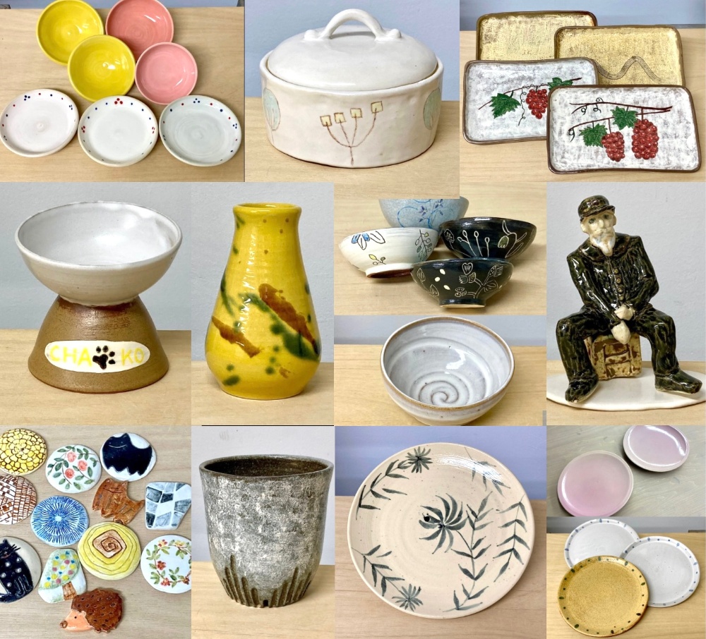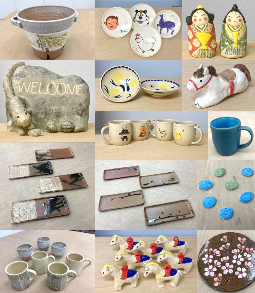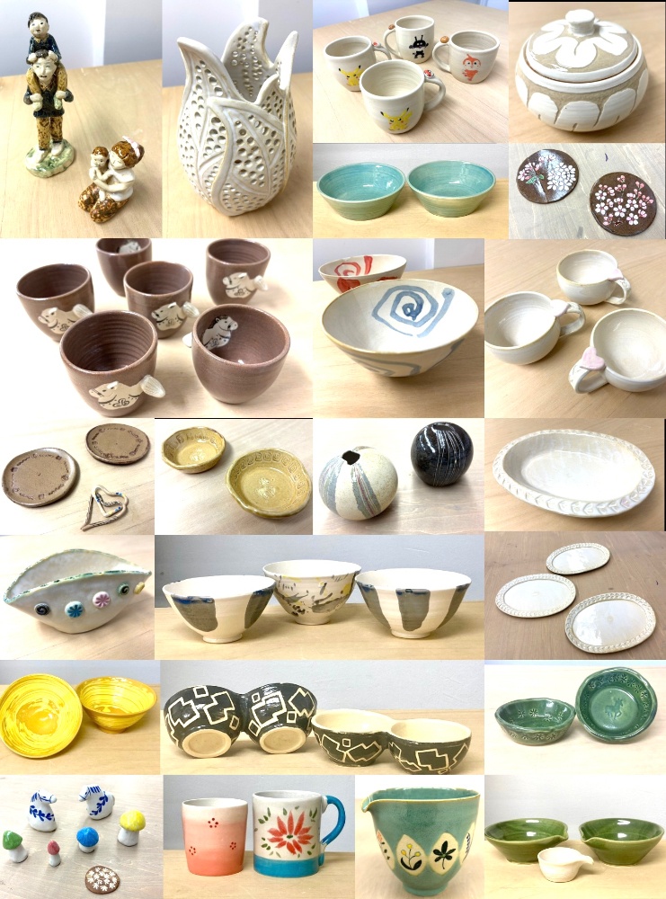 | 料金 | *入会金・5000円(5500円税込)入会金無料キャンペーン中! *プレミアム(フリー)コース 15000円(16500円税込)/月 *スタンダード(月4回)コース 12000円(13200円税込)/月 *ハーフ(月2回)コース 6000円(6600円税込)/月 *校費(教室維持費・事務手数料) 455円(500円税込)/月 *粘土代2kg(焼成費、釉薬込) 2637円(2900円税込) 釉薬/焼成費込みですので作品の大きさも自由です *1日体験 3000円(3300円税込) |